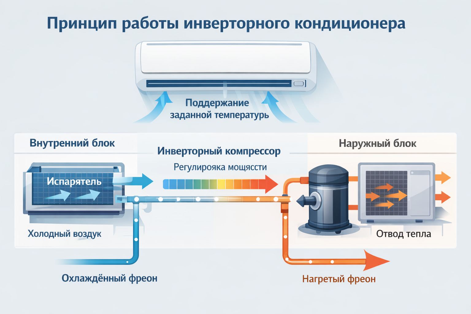 Инверторный кондиционер — это сплит-система, в которой компрессор работает не по принципу «включился на максимум — выключился», а плавно регулирует мощность в зависимости от температуры в помещении.