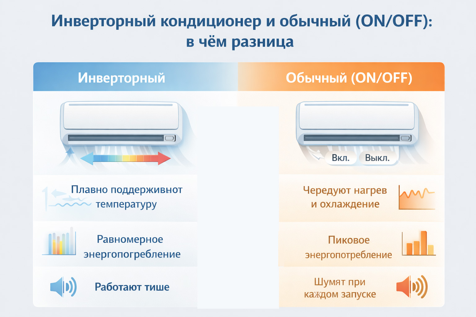 Обычный кондиционер (ON/OFF) включается на полную мощность, охлаждает помещение и полностью отключается. Когда температура снова повышается, цикл повторяется.